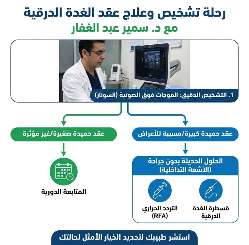 الآن، ومع تطور الأشعة التداخلية، تغير المفهوم تمامًا. يقدم دكتور سمير عبد الغفار خيارات علاجية غير جراحية تحافظ على وظيفة الغدة وتنهي معاناة المريض دون مشرط جراح.